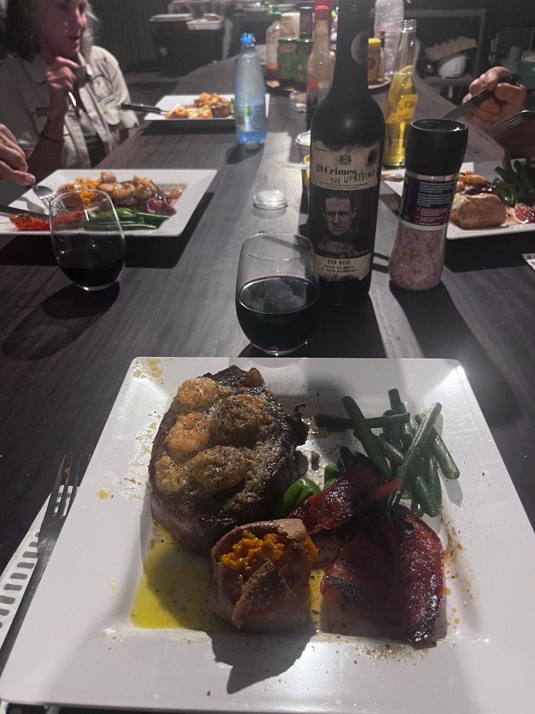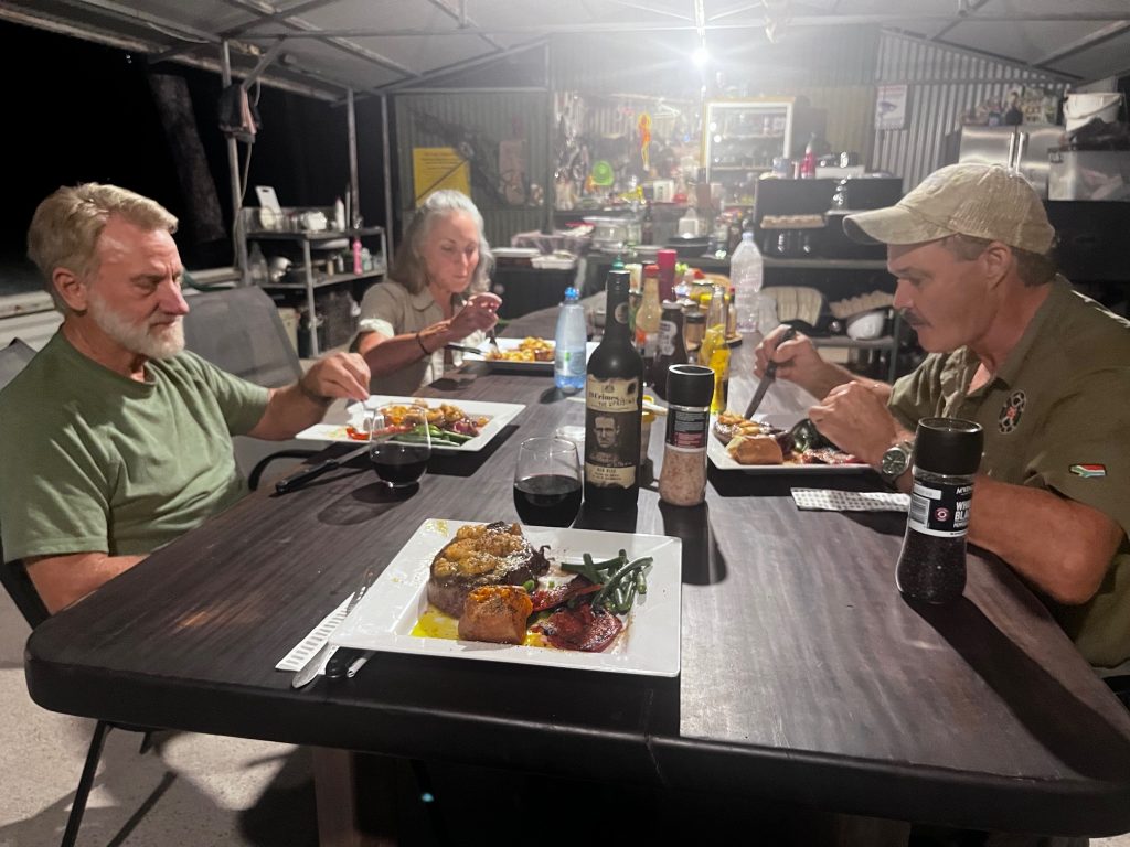 After a long day hunting, nothing is better than returning to a cold beer and a variety of snacks. A hot shower also awaits the weary hunter. Then dinner is served. Meat and vegetables grace the table every night. From thick cut, Australian beef, steaks to mixed fajitas with all the trimmings, every meal will please the taste buds and fill the stomach. Meat from harvested buffalo is used to make our signature corned beef and cabbage with mustard sauce and buffalo meatloaf is always a hit.